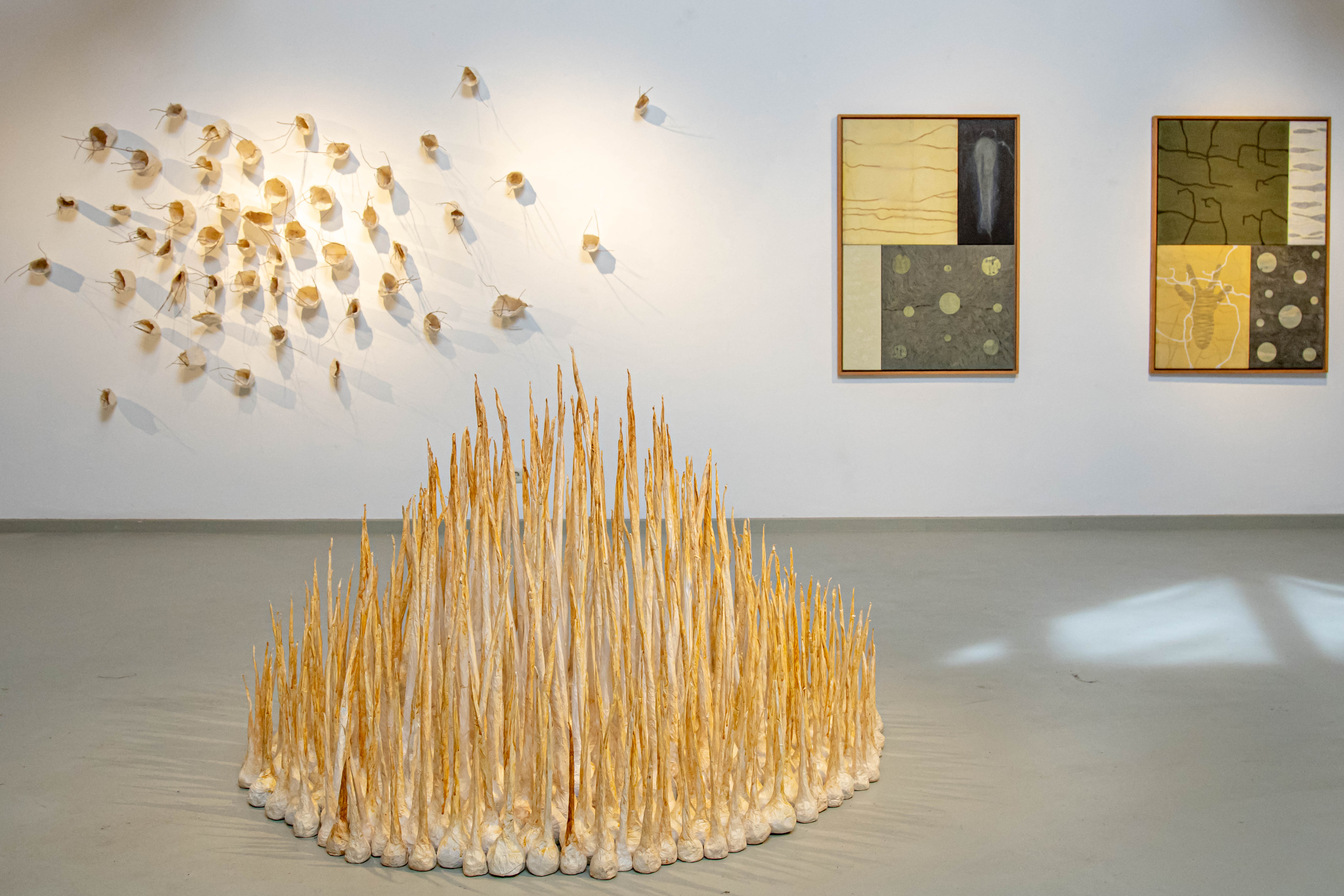 Über diese und ähnliche kleinformatigen Werke hinaus entfaltet ihr Oeuvre in der Kunststation eine bemerkenswerte Vielfalt. In einer Halle errichtete sie einen größeren Garten: Papierobjekte und Zweige formen eine Wand aus „Blüten“, am Boden liegen „Blätterwirbel“ oder wachsen „Blütenstämme“, so die Titel. Die „Keime“ bilden eine zentrale Installation aus knolligen Körpern. Sie verdichten sich zur Mitte, daraus wachsen unterschiedlich hohe Triebe.