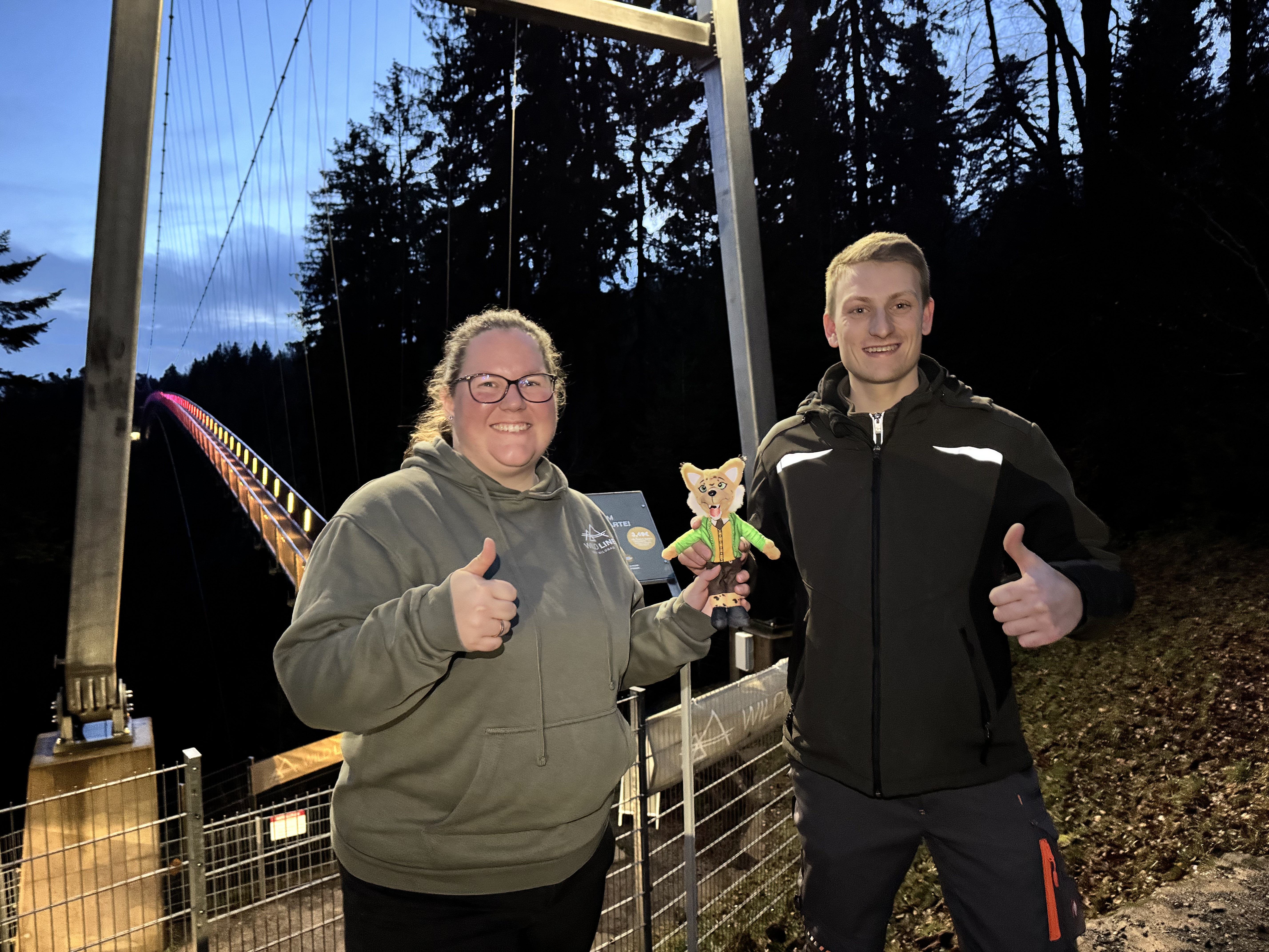 „Schon mit dem ersten Einschalten waren die ersten Besucher da“, erzählt Franzioska Pasch, Standortleiterin der Wildline, erfreut. Eine ganze Woche lang sei an der Installation gearbeitet worden. Techniker Lenny Schwarz, der das Projekt verantwortete, zeigt sich ebenfalls zufrieden: „Das Ergebnis kann sich sehen lassen.“ Gemeinsam mit Maskottchen Lenny Luchs posierten beide vor der farbig beleuchteten Brücke für Erinnerungsfotos.